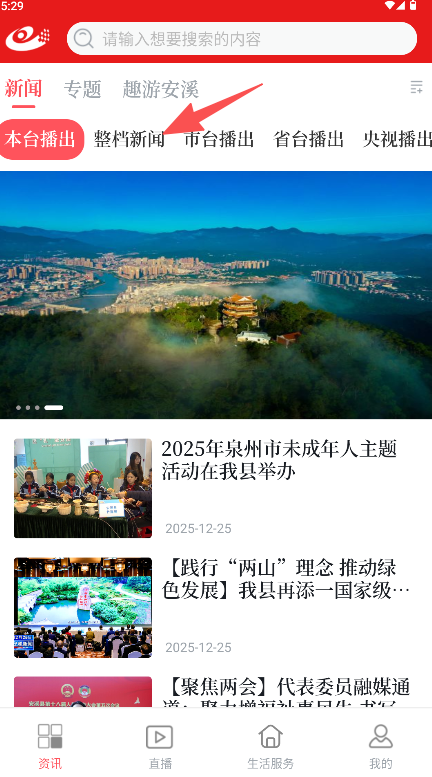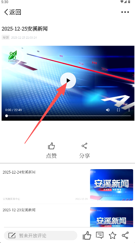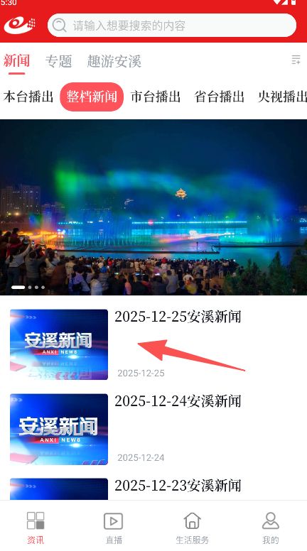 2、在新闻板块找到并点击日期条目如“2025-12-25安溪新闻”进入播放页。
