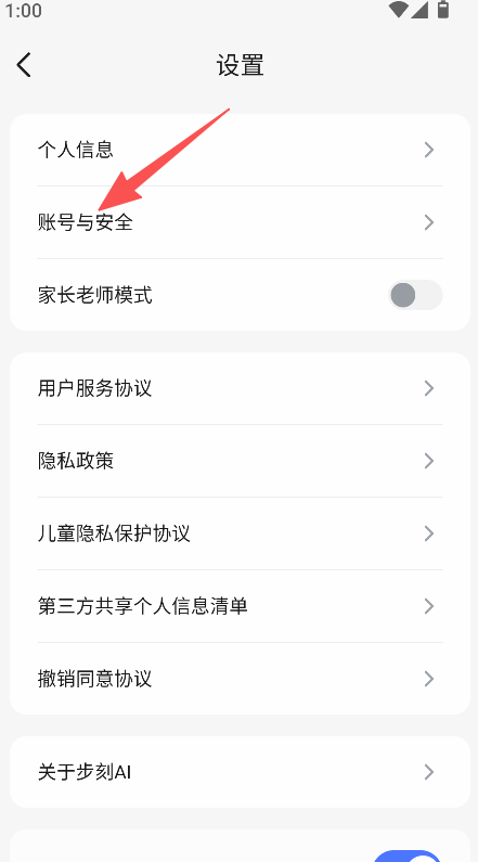 《步刻AI》是一款支持个人账号管理的软件,设我的页面,含我的缓存我的收藏兑换中心设置等选项,设置页涵盖个人信息账号与安全等内容,账号与安全展示步刻ID手机号绑定状态,支持微信账号绑定操作,配备注销账号功能,还含家长老师模式及各类服务协议,助力用户管理个人账号相关信息。