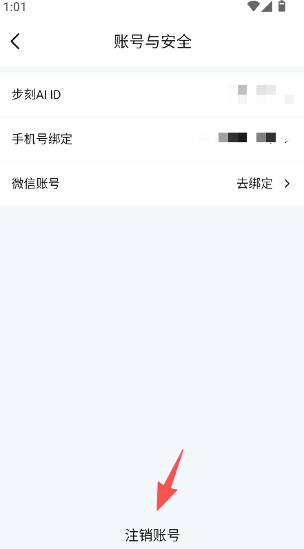 2、支持账号与安全功能,查看步刻ID手机号绑定状态,进行微信绑定或注销账号的操作。