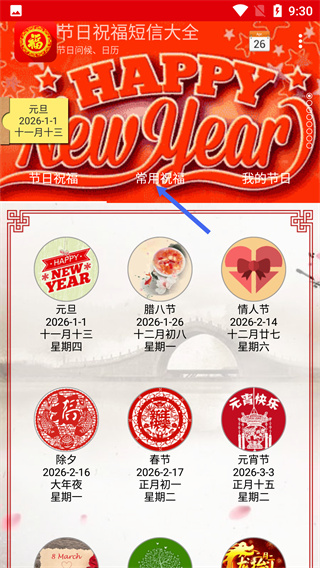 1、在节日祝福短信大全主页面,点击【常用祝福】标签,切换至常用祝福的分类列表页面,查看各类祝福分类。