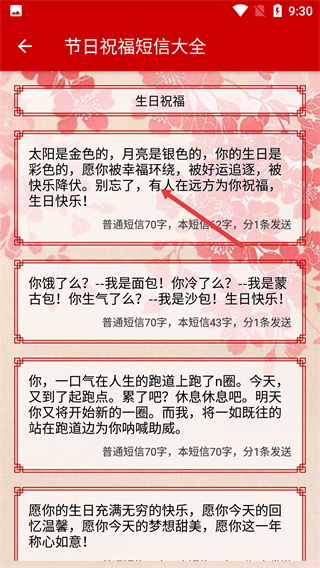 2、在常用祝福分类列表页,点击【生日祝福】选项,进入生日祝福对应的短信内容列表页面,准备选择祝福短信。