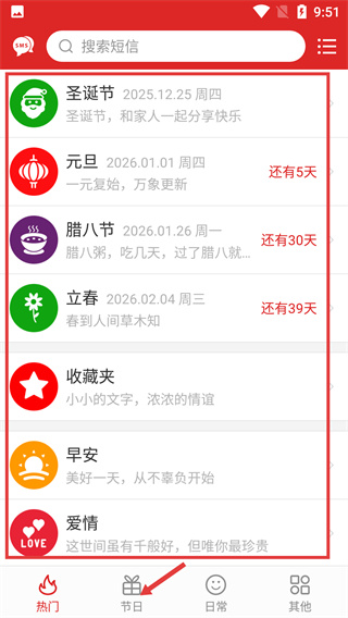 1、在短信应用主页面,点击底部“节日”标签,切换至节日分类页面,查看各类节日对应的祝福短信分类。