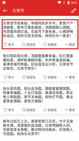 3、在元宵节祝福短信列表中,选定目标短信后点击其下方的“贺卡”按钮,进入该内容对应的贺卡预览界面。