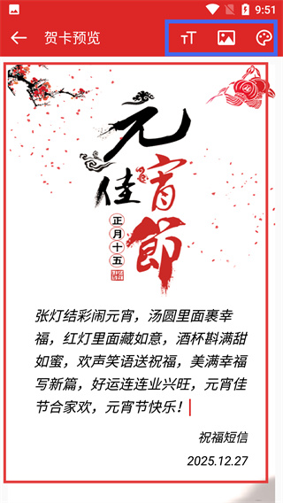 4、在贺卡预览界面,可查看元宵节祝福贺卡的样式,同时能通过顶部功能按钮调整贺卡的文字、样式等内容。
