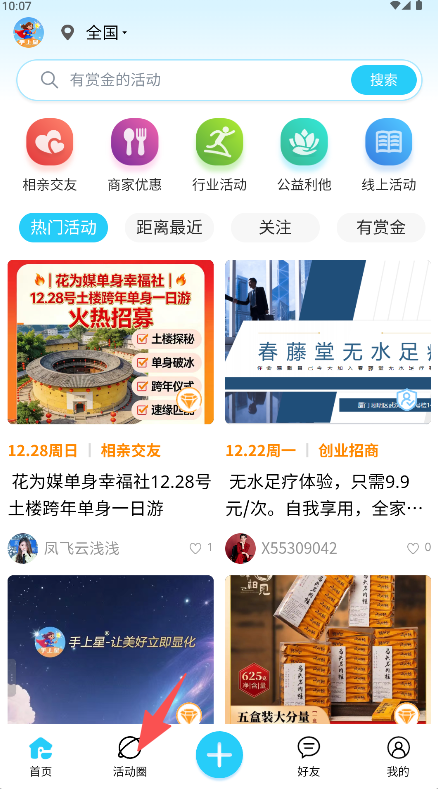 1、在首页底部导航栏找到并点击“活动圈”入口进入。
