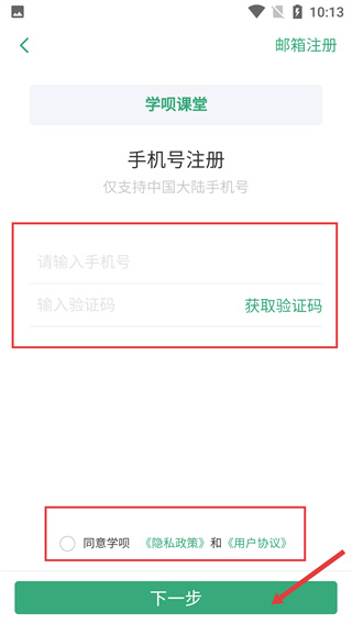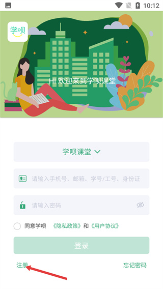 1、在学呗课堂登录页面,点击“注册”按钮,进入手机号注册的操作界面,准备启动账号注册流程。