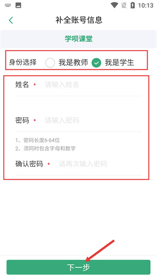 3、在补全账号信息页面,选择身份,填写姓名与符合要求的密码后,点击“下一步”,进入密保问题设置页面。