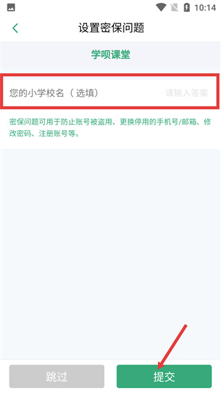 4、在设置密保问题页面,填写选填的密保内容后,点击“提交”按钮,完成学呗课堂的账号注册流程。