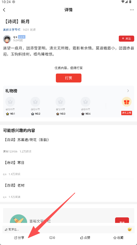 3、在文章详情页底部找到分享并点击。