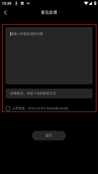 4、在意见反馈页面,填写需反馈的问题内容,可补充联系方式、选择上传日志,完成后点击“提交”按钮即可发送反馈。