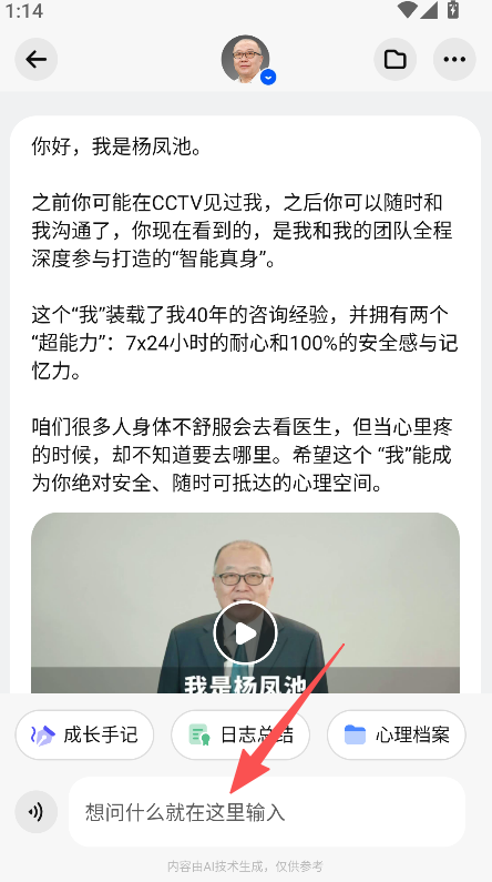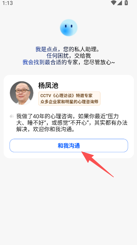 《点点专家》是一款心理服务类软件,设私人助理点点,可匹配心理专家。如杨凤池,为CCTV心理访谈特邀专家,有40年咨询经验,其团队打造智能真身,具备7x24小时耐心及安全感。软件设成长手记日志总结心理档案功能,可在输入框咨询,还有专家视频介绍,助力心理相关沟通。