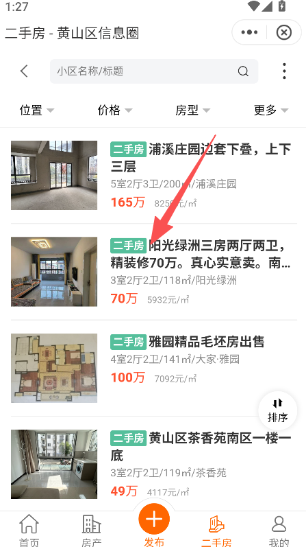 2、在二手房页面选择目标房源,点击进入详情界面。