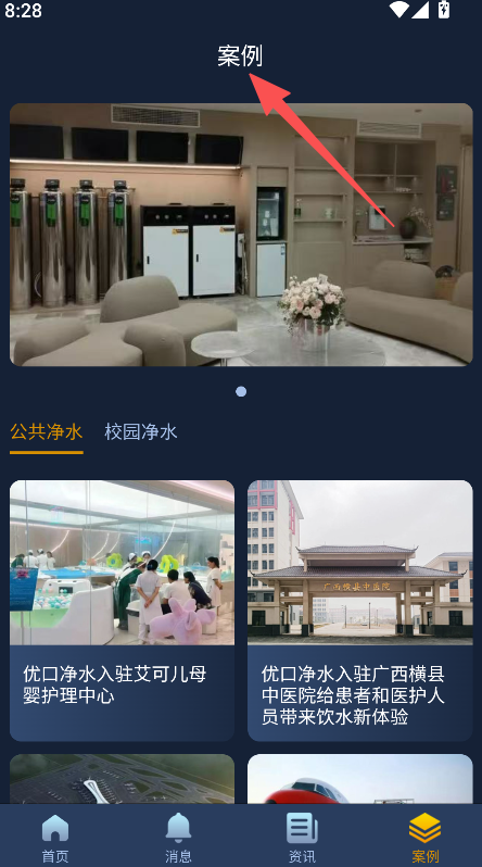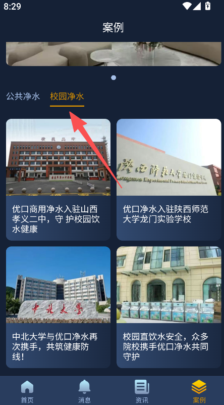 2、支持分类切换功能,在案例页面点击校园净水,查看对应场景的净水服务案例。