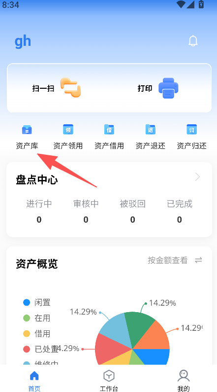 2、含盘点中心板块展示盘点进度,资产概览以饼图呈现状态占比,直观呈现资产整体情况。