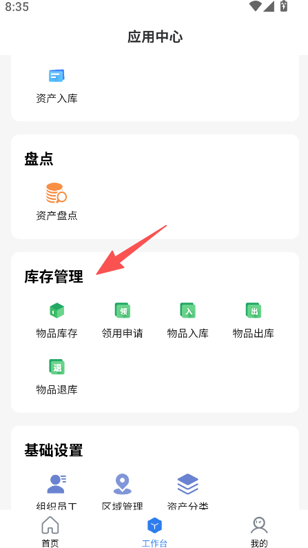 3、提供库存管理操作,进入工作台页面,使用物品库存领用申请等相关功能。