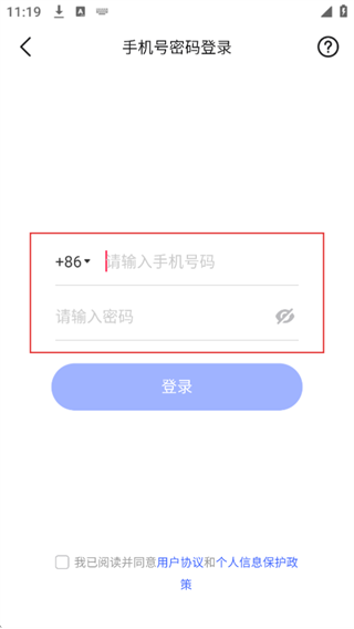 4、在手机号码密码登录页面,输入已注册的手机号码和对应密码,勾选用户协议后点击“登录”按钮,即可完成账号登录。