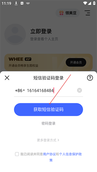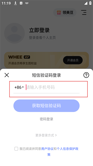 4、输入手机号码后,勾选用户协议,点击“获取短信验证码”按钮,待收到验证码后填入对应输入框,即可完成登录操作。