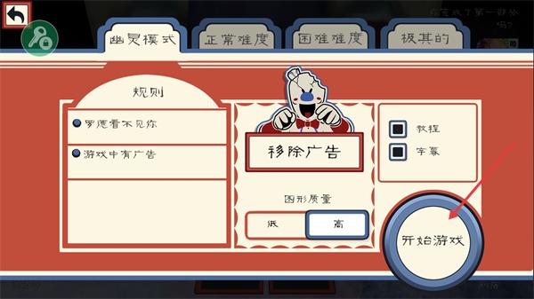 1、在规则界面选择难度后,可点击【移除广告】,再点【开始游戏】进入游戏,规则含【罗德看不见你】-【游戏中有广告】。