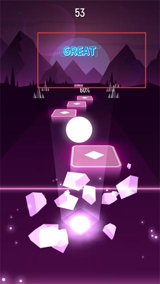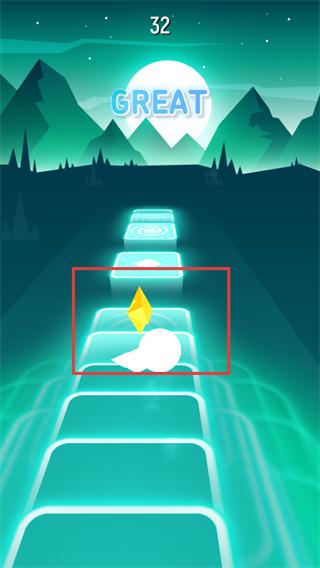 3、操控球体收集路径上的【黄色菱形】道具,完成操作后可触发【GREAT】判定,提升得分。