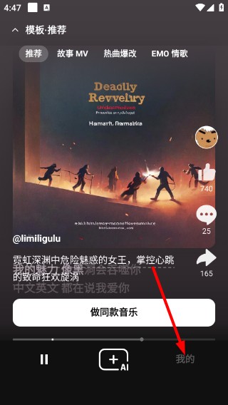 1、在【模板-推荐】页面,可浏览分类内容,点击【做同款音乐】生成相似音乐,再点底部【我的】进入个人页面。