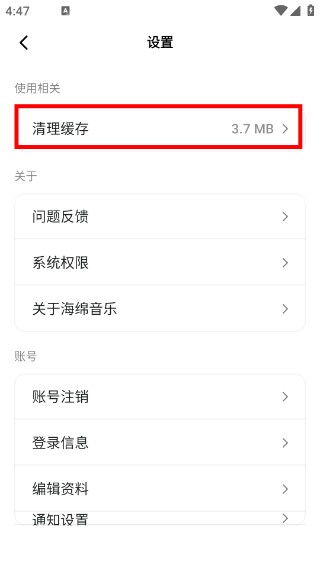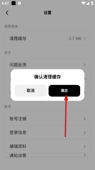 3、在【设置】页面,找到【清理缓存】选项(当前3.7-MB),点击该选项可启动缓存清理的确认流程。
