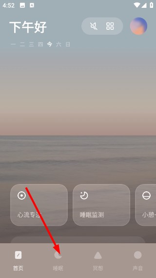 1、在首页可看到【心流专注】-【睡眠监测】等功能,点击底部【睡眠】选项,即可进入睡眠相关功能页面。