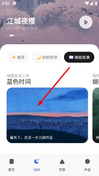 2、进入睡眠页面,可查看【江城夜樱】等内容,找到【蓝色时间】睡眠故事,点击其展示区域进入详情页。