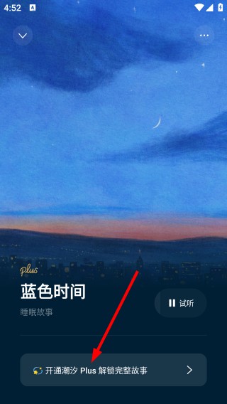 4、在【蓝色时间】页面,点击【开通潮汐Plus解锁完整故事】选项,即可解锁该睡眠故事的完整内容。