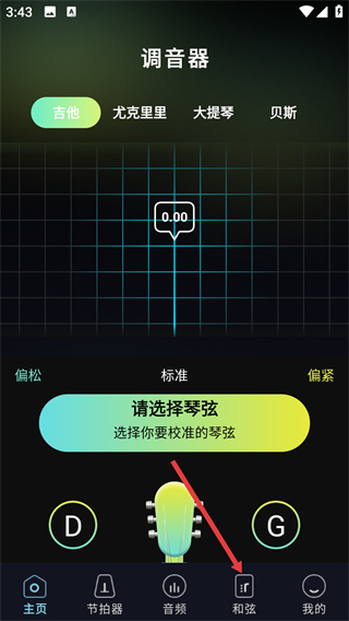1、在【调音器】页面(支持【吉他】-【尤克里里】等乐器),点击底部【和弦】选项,进入和弦相关功能页面。