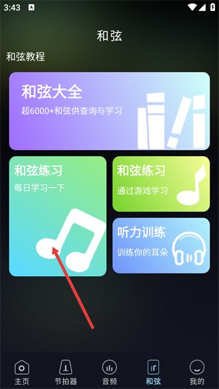 2、进入【和弦】页面,可查看【和弦大全】等功能,点击【和弦练习】选项,进入和弦练习的课程列表页面。
