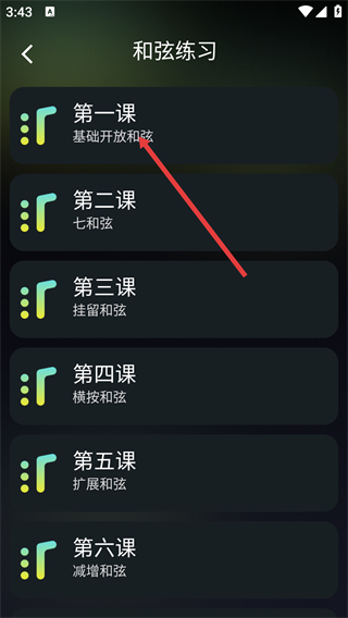3、在【和弦练习】课程列表中,选择【第一课-基础开放和弦】选项,进入该课程的具体和弦学习页面。