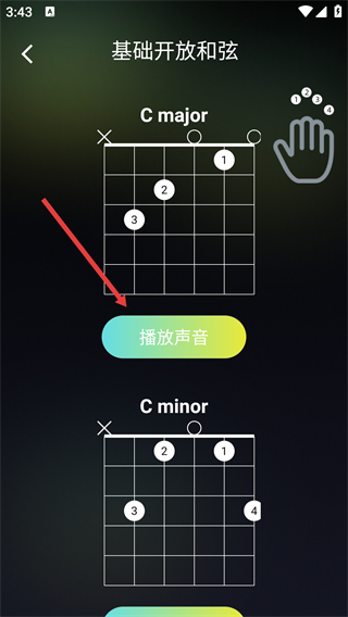 4、进入【基础开放和弦】页面,可查看【C-major】等和弦指法,点击【播放声音】按钮,收听对应和弦的音效。