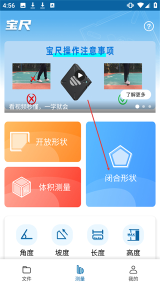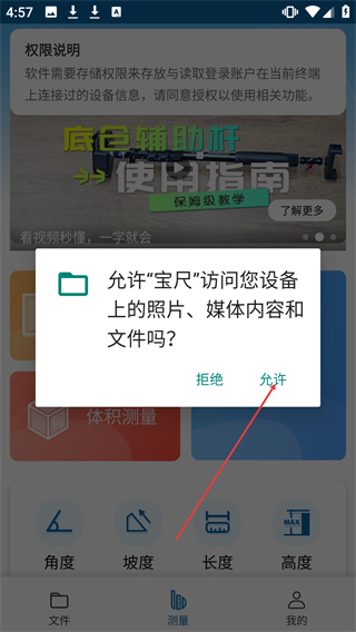 1、在宝尺的测量页面,点击【闭合形状】选项可触发权限请求弹窗。