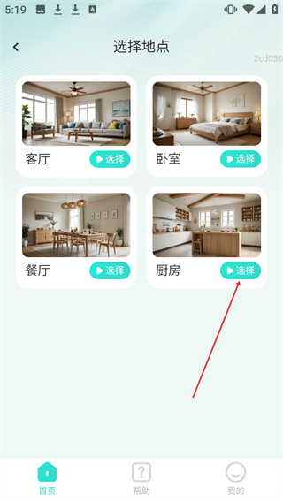 3、在选择地点页面,点击【厨房】对应的【选择】按钮可进入风扇控制页面。