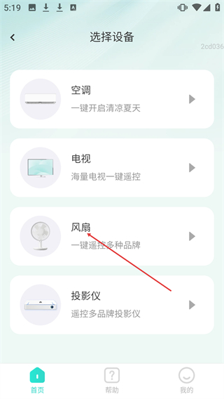 2、在选择设备页面,点击【风扇】选项可进入选择地点页面。