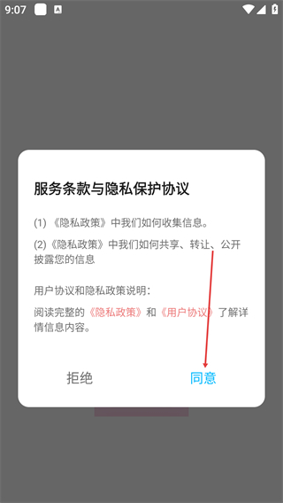 1、阅读【服务条款与隐私保护协议】,点击【同意】进入应用。