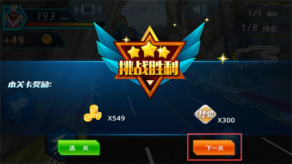 4、关卡结束获得【挑战胜利】后,领取金币与道具奖励,点击【下一关】继续赛车关卡挑战。