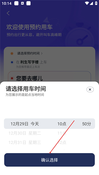 2、选择用车时间后,点击【确认选择】按钮确定预约时间。