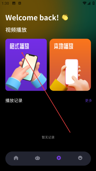 2、在视频播放页,点击【格式播放】选项进入视频素材选择操作页面。