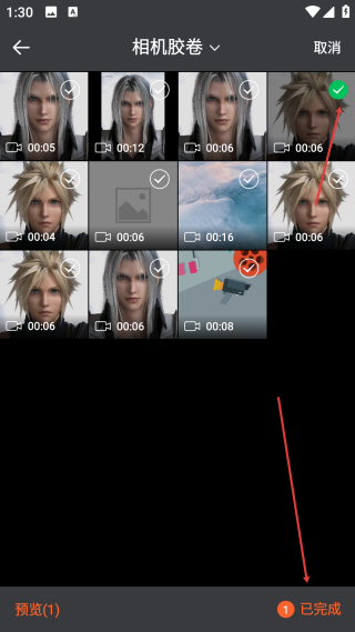 3、在相机胶卷页,选中【目标视频】后点击【已完成】进入格式播放页。