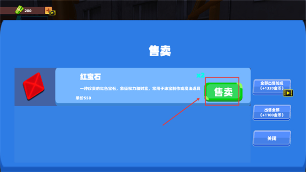 4、售卖界面选【红宝石】点击【售卖】得金币,可用全部出售加成提收益,积累资源助力挖掘。