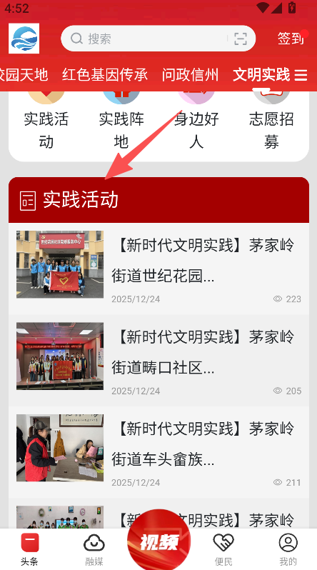 2、支持实践活动浏览功能,在文明实践板块中,查看各类新时代文明实践活动列表。