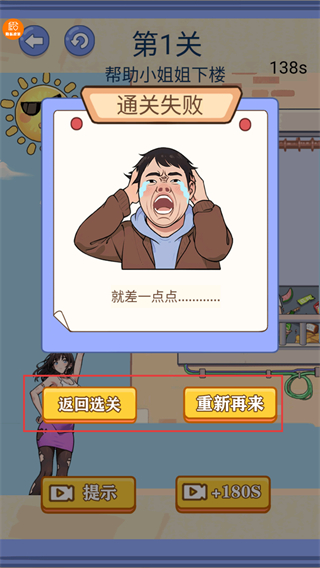 4、若通关失败,可选择【返回选关】切换其他关卡,或点击【重新再来】再次挑战当前关卡。