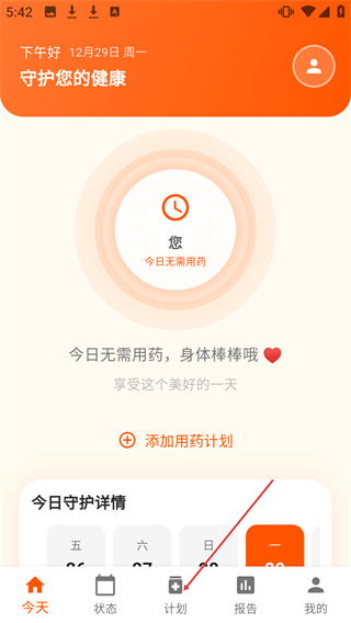 1、点击底部的【计划】按钮,进入服药计划页面。