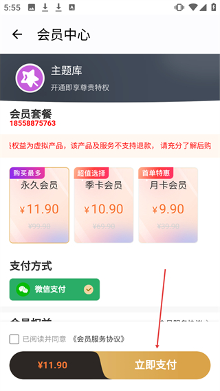 4、勾选协议后点击【立即支付】按钮,可完成会员套餐的支付操作。