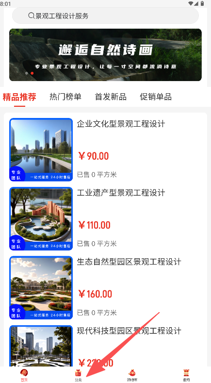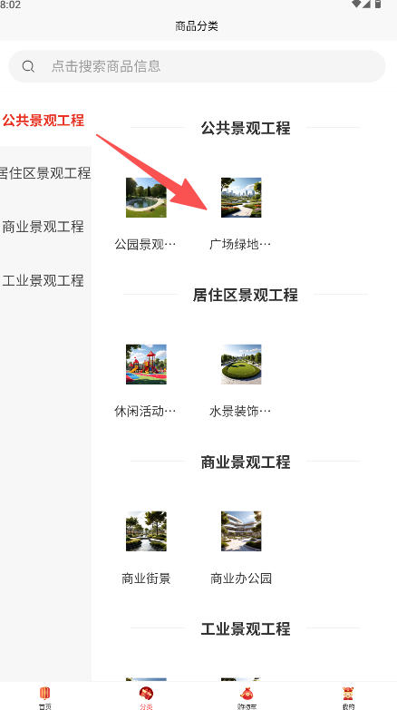 2、在分类页面选择“公共景观工程”并点击其下的“广场绿地”子类进入。