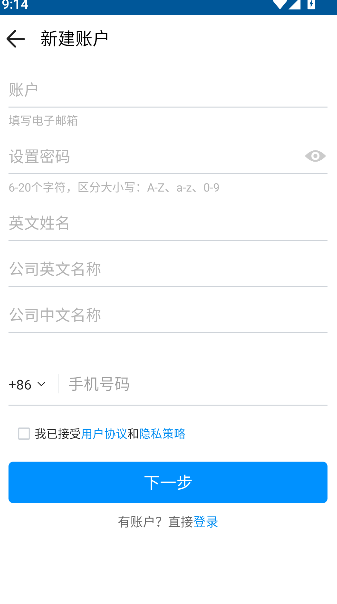 2、根据页面提示填写账户、密码、英文名、公司名称、手机号等信息完成注册。
