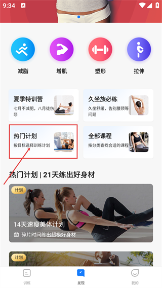 1、点击【热门计划】,可按目标选择训练计划,该板块聚合适配【减脂-增肌-塑形】等需求的预设方案,便于快速锁定适配的健身安排。