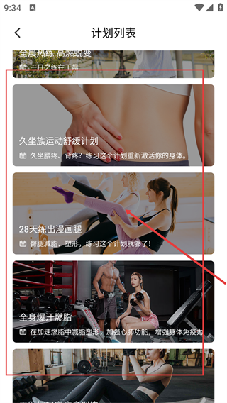 2、进入【计划列表】,可选择【久坐族运动舒缓计划】【28天练出漫画腿】等计划,精准匹配自身的健身需求与目标。