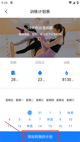 3、查看【28天练出漫画腿】的计划详情后,点击【添加到我的计划】,即可将该训练安排纳入个人的计划列表。